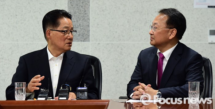 (서울=포커스뉴스) 박지원(왼쪽) 국민의당 원내대표가 29일 오전 서울 여의도 국회 의원회관에서 경제활성화법안 등 처리 요청을 위해 방문한 유일호 경제부총리 겸 기획재정부 장관과 면담을 하고 있다.