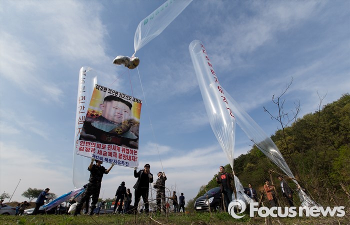 (파주=포커스뉴스) 29일 오후 경기 파주 낙하IC 인근에서 탈북자단체인 자유북한운동연합이 북한에 핵과 미사일을 포기하고 국제사회 일원으로 참여할 것을 촉구하는 내용의 대북전단을 날려보내고 있다.