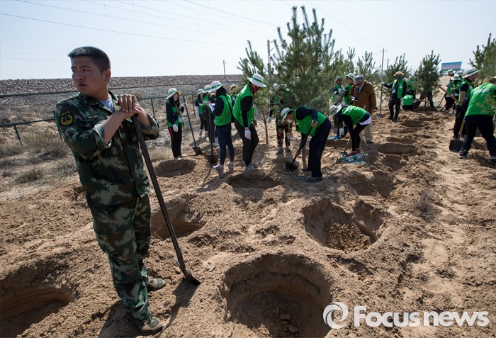 (다라더치/중국=포커스뉴스) 25일 오전 중국 내몽고 다라더치 쿠부치사막에서 2016 미래숲 15기 녹색봉사단원들이 나무 심기 작업을 하고 있다. 미래숲 녹색봉사단은 이번 봉사활동을 통해 황폐화된 사막에 나무 심기 및 각국 청년들과 우호를 증진을 위한 교류 활동을 전개했다.