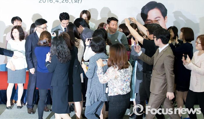(서울=포커스뉴스) 26일 오후 서울 종로구 서울지방국세청에서 직원들이 국세청 홍보대사로 위촉된 배우 조인성과 기념촬영을 하기 위해 무대로 달려나오고 있다.