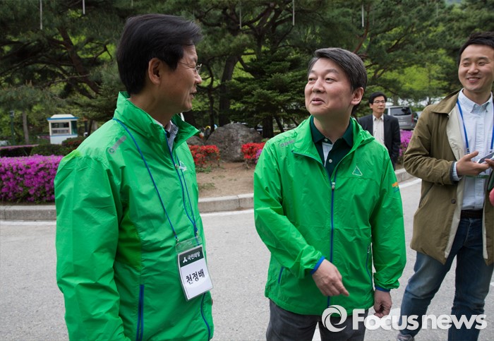 (양평=포커스뉴스) 국민의당 20대 총선 당선자 워크숍 이틀째인 27일 오전 경기도 양평 한화리조트에서 안철수 국민의당 상임공동대표와 천정배 공동대표가 아침 산책을 마친 후 대화하고 있다.