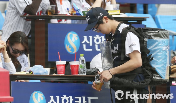 (서울=포커스뉴스) 더운 여름 날씨같은 5월 첫 날, 잠실구장에서 낮 경기로 열린 2016 프로야구 kt-LG 전. 최근 국세청이 야구장에서 맥주의 이동판매를 허용한뒤 맥주보이가 관중석을 돌아다니며 시원한 맥주를 관중에게 판매하고 있다.