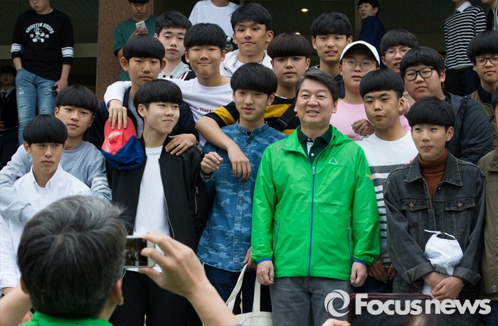| △ 학생들과 기념촬영하는 안철수 |