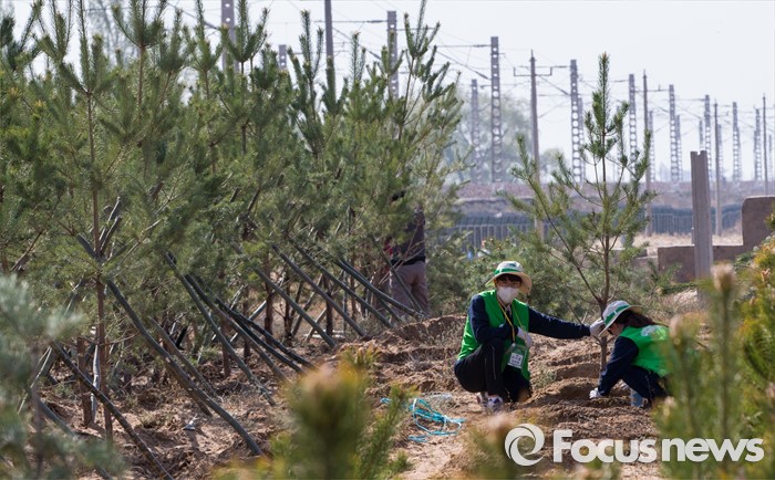 (다라더치/중국=포커스뉴스) 25일 오전 중국 내몽고 다라더치 쿠부치사막에서 2016 미래숲 15기 녹색봉사단원들이 나무 심기 작업을 하고 있다. 미래숲 녹색봉사단은 이번 봉사활동을 통해 황폐화된 사막에 나무 심기 및 각국 청년들과 우호를 증진을 위한 교류 활동을 전개했다.