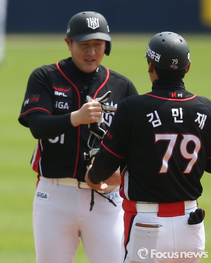 (서울=포커스뉴스) 1일 서울 잠실구장에서 열린 2016 프로야구 kt-LG 경기 1회초 1사 1,3루에서 kt 유한준이 2타점 좌중간 2루타를 치고 김민재 코치의 축하를 받고 있다.