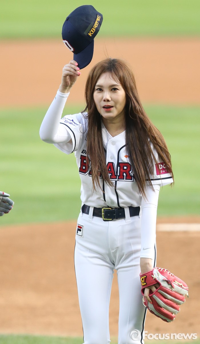 (서울=포커스뉴스) 28일 서울 잠실구장에서 열린 2016 프로야구 SK-두산 경기에 앞서 가수 김현정이 시구를 마치고 모자를 벗고 인사하고 있다..