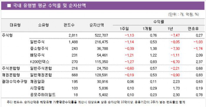 K200인덱스펀드가 대형주 약세로 1.27% 하락하며 국내 주식형펀드 중 가장 부진한 성과를 보였다. 배당주식펀드와 일반주식펀드도 각각 1.21%, 1.14% 하락한 것으로 나타났다.