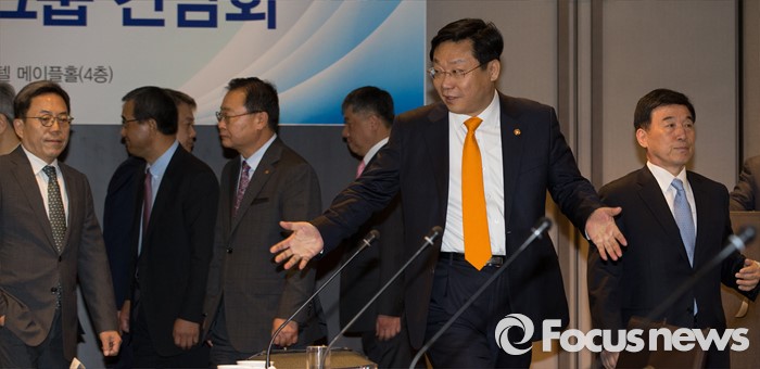 (서울=포커스뉴스) 주형환 산업통상자원부 장관이 26일 오전 서울 중구 더플라자에서 열린 '산업부 장관-10대 그룹 간담회'에서 참석자들에게 자리를 권하고 있다.