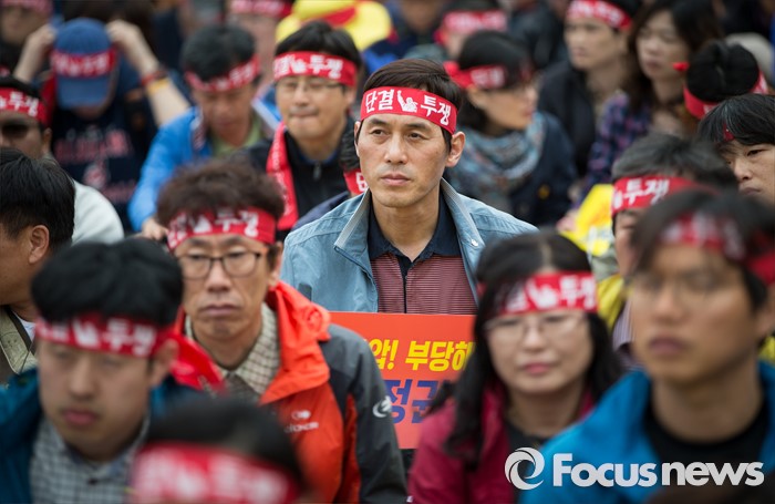 (서울=포커스뉴스) 27일 오후 서울 종로구 정부종합청사 앞에서 전교조(전국교직원노동조합)와 민주교육과 전교조 지키기 전국행동의 주최로 법외노조 후속조치 규탄 및 부당해고 저지, 노동기본권 쟁취를 위한 집회가 열리고 있다.