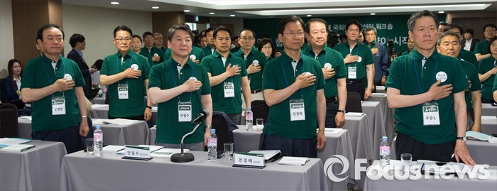 김희경 대변인은 정책위의장 선출과 관련해선 "박 의원이 김성식 당선인을 정책위의장에 추천했고 당선자들이 만장일치로 통과시켰다"고 전했다.(양평=포커스뉴스) 안철수(왼쪽 네번째) 국민의당 상임공동대표, 천정배(오른쪽 세번째) 공동대표와 20대 총선 당선인들이 26일 오후 경기도 양평 한화리조트에서 열린 워크숍에 참석해 국민의례를 하고 있다. 2016.04.26 오장환 기자