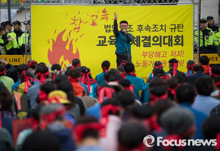 (서울=포커스뉴스) 27일 오후 서울 종로구 정부종합청사 앞에서 전교조(전국교직원노동조합)와 민주교육과 전교조 지키기 전국행동의 주최로 교육주체 결의대회가 열리고 있는 가운데 변성호 전교조 위원장이 대회사를 하고 있다.