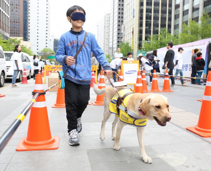 이날 행사에서는 청계광장 입구부터 광통교까지(약 600m) 구간을 자원봉사자와 훈련사가 안내견, 훈련견들과 함께 걸으며 시민들에게 안내견 환영 스티커를 나눠주고, 시각장애인과 안내견은 공공장소 등에 출입시에 법적으로 보장받는다는 점을 알렸다.<사진제공=삼성화재>