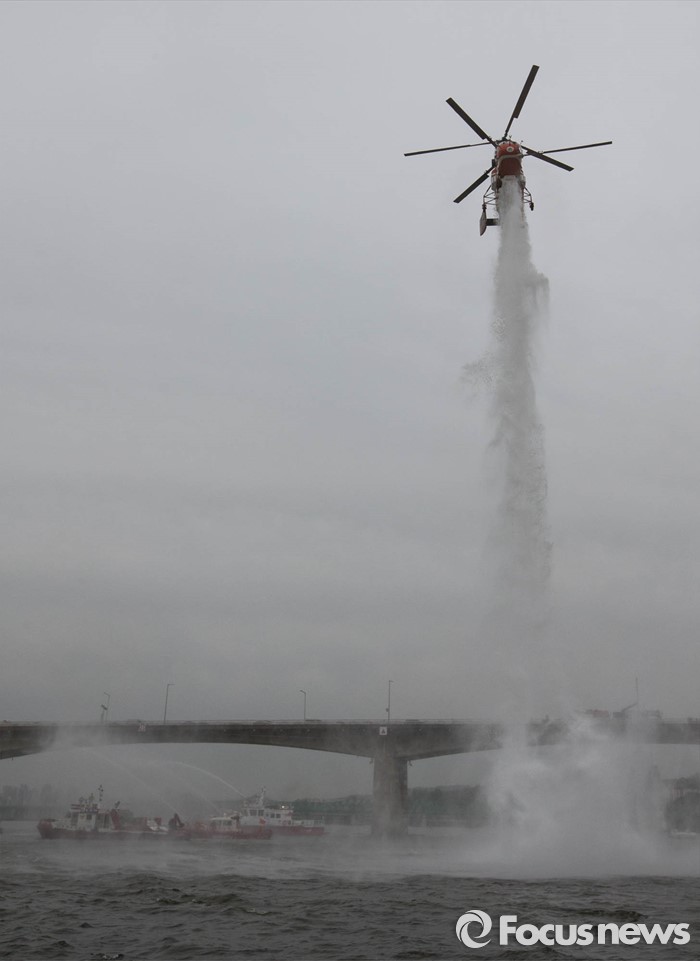 (서울=포커스뉴스) 27일 오전 서울 영등포구 여의도 한강공원 원효대교 일대에서 '수도 서울 민․관․군 합동 대규모 복합재난 가상훈련'이 진행되고 있다.