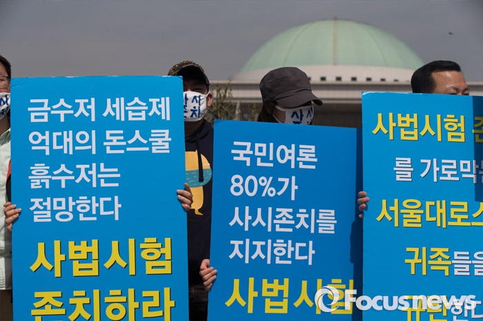 (서울=포커스뉴스) 26일 오전 서울 영등포구 국회의사당 앞에서 사법시험 준비 고시생들이 사법시범 존치를 촉구하고 있다.