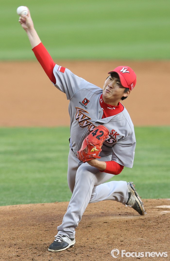 (서울=포커스뉴스) 28일 서울 잠실구장에서 열린 2016 프로야구 SK-두산 경기에서 1회말 SK 선발투수 문승원이 투구하고 있다.