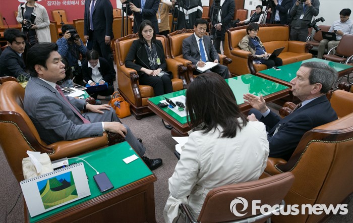 (서울=포커스뉴스) 원유철(왼쪽) 새누리당 원내대표가 27일 오후 서울 여의도 국회를 방문한 로버트 아인혼 전 미국 국무부 차관보와 면담을 하고 있다.