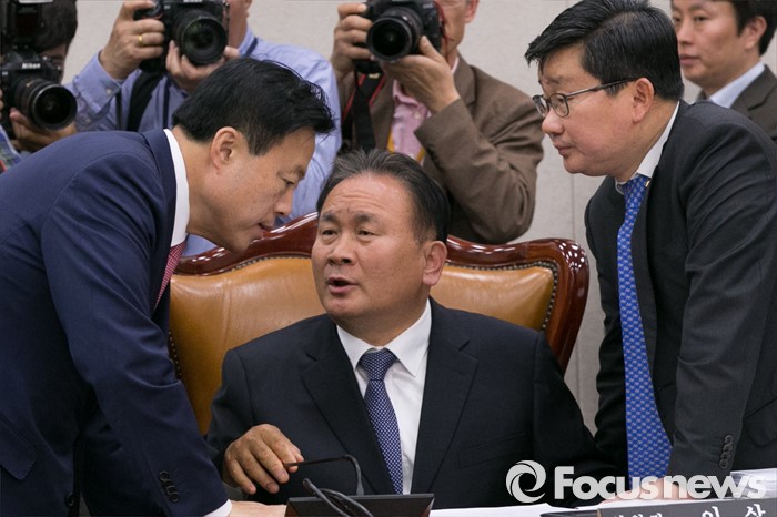 (서울=포커스뉴스) 이상민(가운데) 법사위원장과 이한성(왼쪽) 여당 간사, 전해철 야당 간사가28일 오후 서울 여의도 국회 법제사법위원회 전체회의장에서 논의하고 있다.