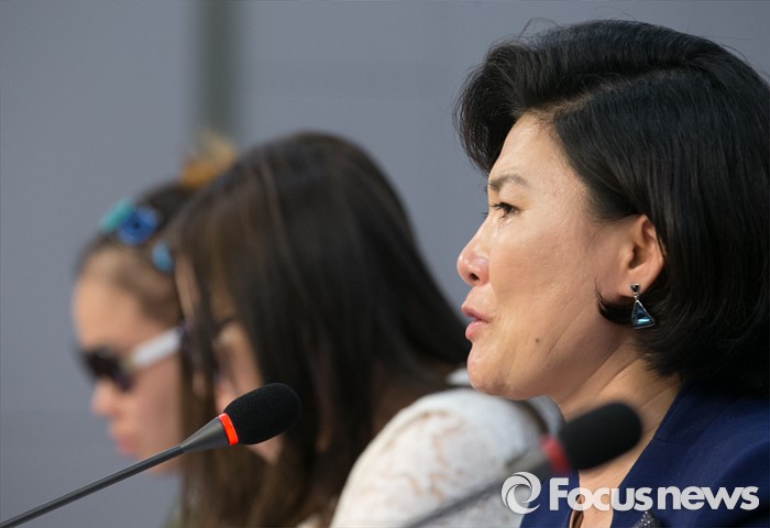 (서울=포커스뉴스) 26일 오후 서울 여의도 국회 의원회관에서 북한자유주간 주최, 통일맘연합 주관으로 열린 중국과 제3국에서 자녀와 헤어진 탈북여성들의 호소, '내 아이를 안고 싶어요' 증언대회에 참석한 북한 여군 장교 출신 탈북 방송인 김정아 씨가 발언 중 눈물을 흘리고 있다.