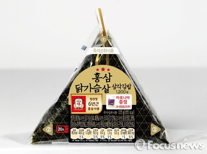 홍삼 삼각김밥은 정관장 6년근 홍삼 농축액을 넣어 만든 홍삼밥에 닭가슴살·죽순·우엉·표고버섯 등을 넣어 만들었다. 판매가는 1200원이다.