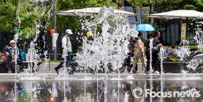 (서울=포커스뉴스) 서울 한낮 기온이 초여름 날씨를 보이는 26일 오후 광화문광장 바닥분수대를 찾은 시민들과 외국인 관광객들이 즐거운 시간을 보내고 있다.