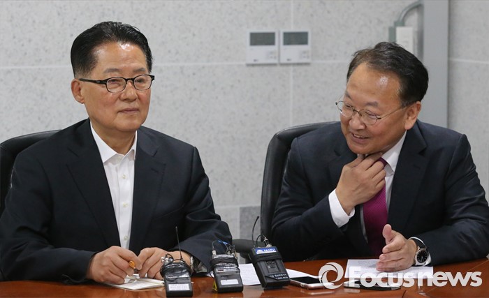 (서울=포커스뉴스) 박지원(왼쪽) 국민의당 원내대표가 29일 오전 서울 여의도 국회 의원회관에서 경제활성화법안 등 처리 요청을 위해 방문한 유일호 경제부총리 겸 기획재정부 장관과 면담을 하고 있다.