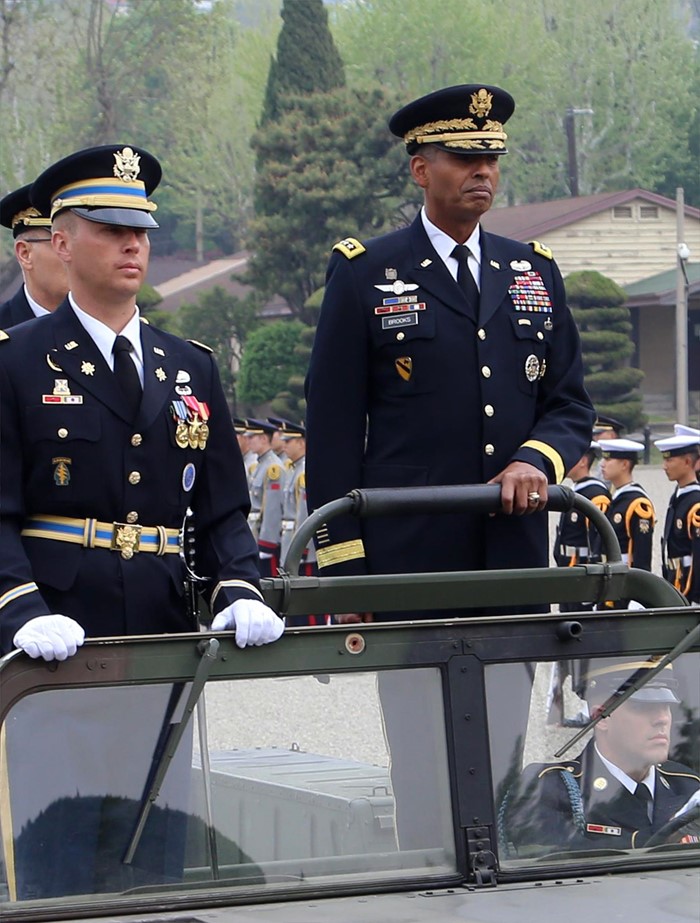 | △ 열병하는 빈센트 브룩스 신임 주한미군사령관 |
