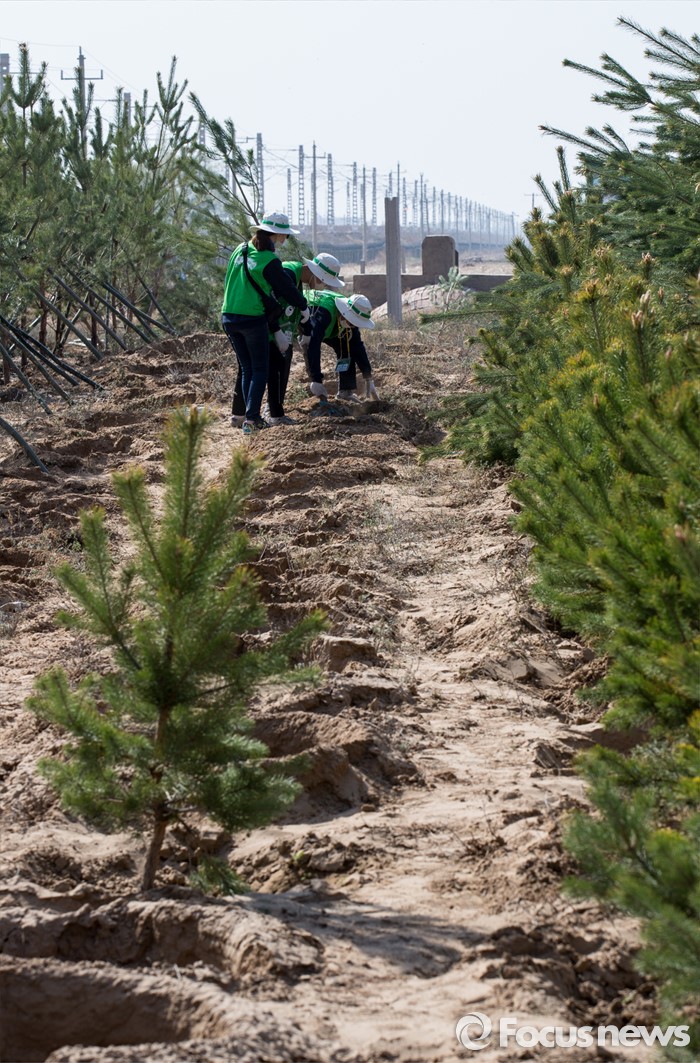 (다라더치/중국=포커스뉴스) 25일 오전 중국 내몽고 다라더치 쿠부치사막에서 2016 미래숲 15기 녹색봉사단원들이 나무 심기 작업을 하고 있다. 미래숲 녹색봉사단은 이번 봉사활동을 통해 황폐화된 사막에 나무 심기 및 각국 청년들과 우호를 증진을 위한 교류 활동을 전개했다.