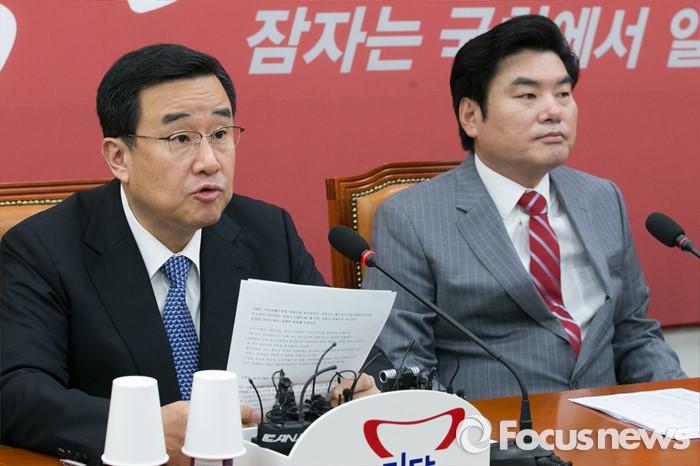 (서울=포커스뉴스) 김정훈(왼쪽) 새누리당 정책위의장이 25일 오전 서울 여의도 국회에서 열린 상임위원장 · 간사단 연석회의에 참석해, 모두발언하고 있다.