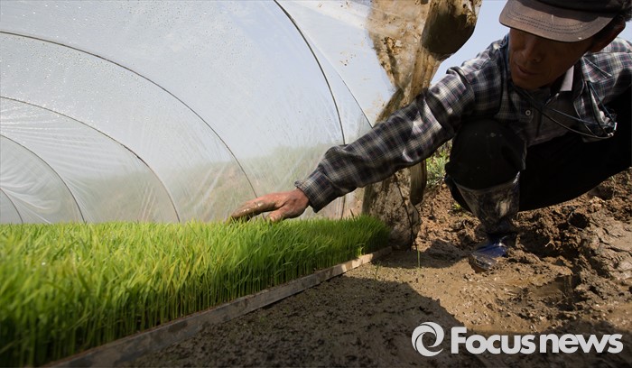 (파주=포커스뉴스) 25일 오전 경기도 파주시 오두산 인근 논밭에서 한 농부가 비닐하우스에 있는 벼들을 위해 공기를 환기시키고 있다.