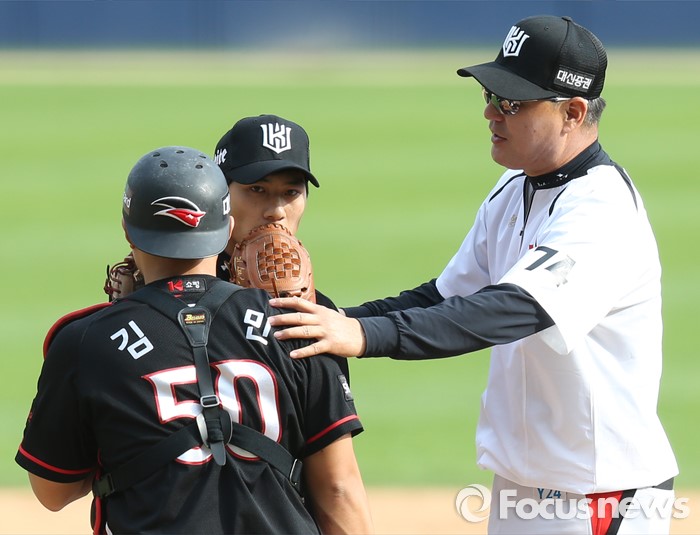 (서울=포커스뉴스) 1일 서울 잠실구장에서 열린 2016 프로야구 kt-LG 경기 7회말 2사후 kt 정명원 코치가 투수 이창재와 포수 김종민의 어깨를 잡고 선전을 당부하고 있다.