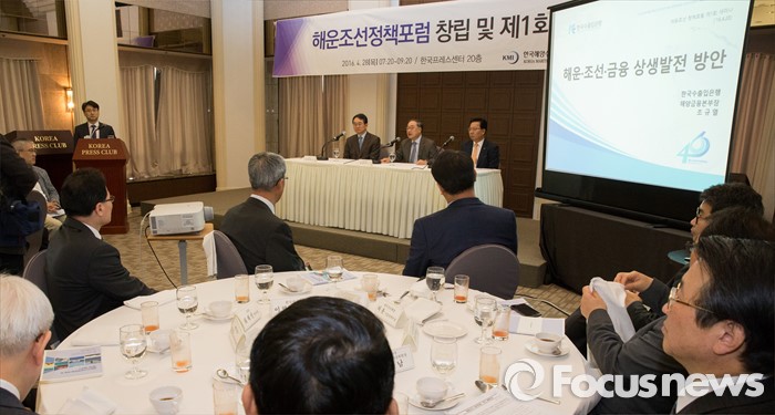 (서울=포커스뉴스) 28일 오전 서울 중구 한국프레스센터에서 열린 '해운조선정책포럼 창립 및 제1회 세미나'에 김성귀(왼쪽부터) 한국해양수산개발원 원장, 전준수 서강대학교 교수, 조규열 해양금융종합센터장이 참석하고 있다.