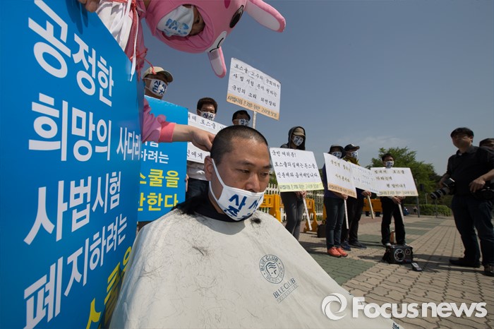 (서울=포커스뉴스) 26일 오전 서울 영등포구 국회의사당 앞에서 사법시험 준비 고시생 이종배씨가 사법시범 존치를 촉구하며 삭발을 하고 있다.
