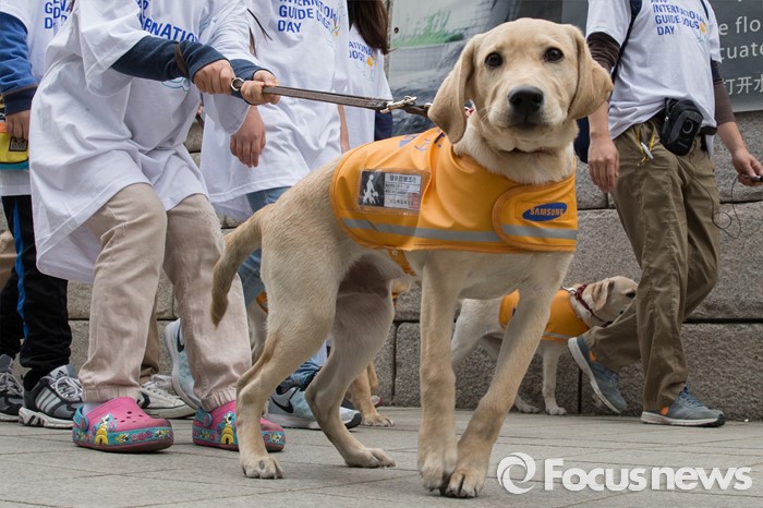 (서울=포커스뉴스) 27일 오전 서울 청계천에서 삼성화재안내견학교 훈련사들과 안내견들이 시민들과 함께 '안내견과의 만남' 행사를 하고 있다.