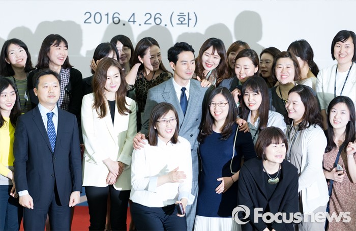 (서울=포커스뉴스) 26일 오후 서울 종로구 서울지방국세청에서 2016 국세청 홍보대사로 위촉된 배우 조인성과 최지우가 직원들과 기념촬영을 하고 있다.