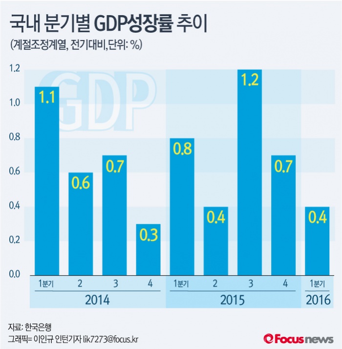 (서울=포커스뉴스) 한국은행이 26일 발표한 ‘2016년 1분기 및 연간 국내총생산(속보)’에 따르면 2016년 1분기 실질 국내총생산(GDP)은 전기 대비 0.4%로 그쳐 실질 GDP 성장률은 2분기 연속 0%대를 기록했다.
