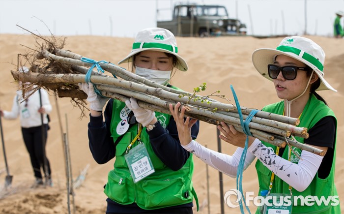 (다라더치/중국=포커스뉴스) 25일 오후 중국 내몽고 다라더치 쿠부치사막에서 2016 미래숲 15기 녹색봉사단원들이 나무 심기 작업을 하고 있다. 미래숲 녹색봉사단은 이번 봉사활동을 통해 황폐화된 사막에 나무 심기 및 각국 청년들과 우호를 증진을 위한 교류 활동을 전개했다.