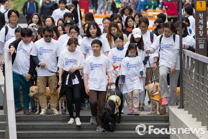 (서울=포커스뉴스) 27일 오전 서울 청계천에서 삼성화재안내견학교 훈련사들과 안내견들이 시민들과 함께 '안내견과의 만남' 행사를 하고 있다.