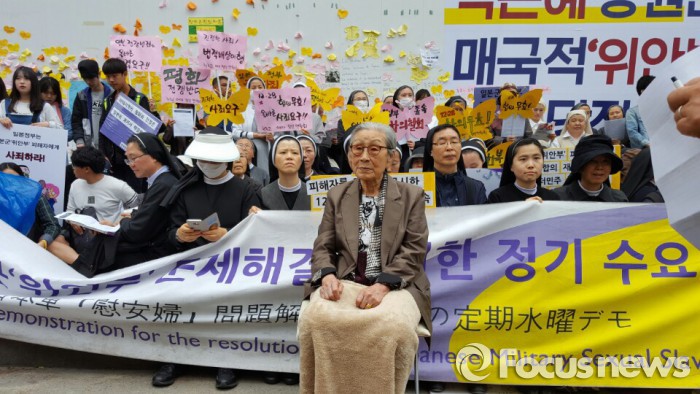 27일 오후 서울 종로구 옛 주한일본대사관 맞은편에서 열린 1228번째 일본군 위안부 문제 해결을 위한 정기 수요집회에서 전날 김종인 더불어민주당 비상대책위원회 대표 발언을 두고 규탄이 이어졌다.