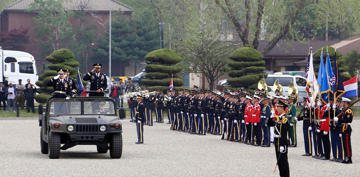 (서울=포커스뉴스) 빈센트 브룩스 신임 한·미연합사령관 겸 주한미군사령관이 30일 서울 용산기지 나이트필드에서 열린 이취임식에서 커티스 스카파로티 현 사령관과 의장대를 열병하고 있다. <사진제공=주한미군 홈페이지>