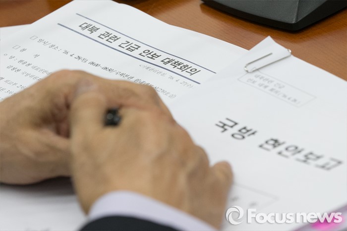 (서울=포커스뉴스) 28일 오전 서울 여의도 국회에서 열린 대북 관련 긴급 안보 대책회의에 국방 현안보고 자료가 놓여 있다.