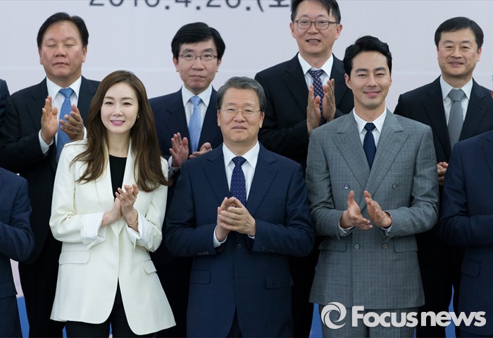 (서울=포커스뉴스) 26일 오후 서울 종로구 서울지방국세청에서 임환수(가운데) 국세청장이 홍보대사로 위촉된 배우 조인성(오른쪽), 최지우와 기념촬영을 하고 있다.