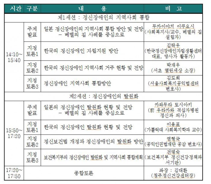 제2세션에서는 △정신장애인 탈원화(脫院化) 현황 및 전망 △ 정신보건법 개정 △복지부의 정신장애인 탈원화 계획 등 구체적인 법·제도적 방안에 대한 토론이 이어진다.