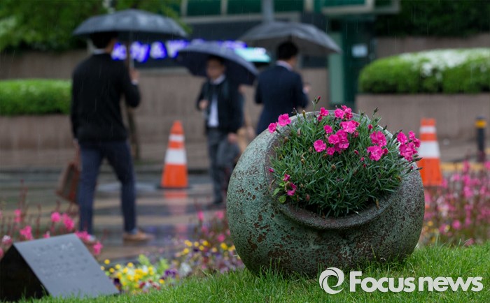 (서울=포커스뉴스) 전국이 흐리고 비가 내리는 3일 오전 서울 청계광장에서 시민들이 발걸음을 재촉하고 있다.