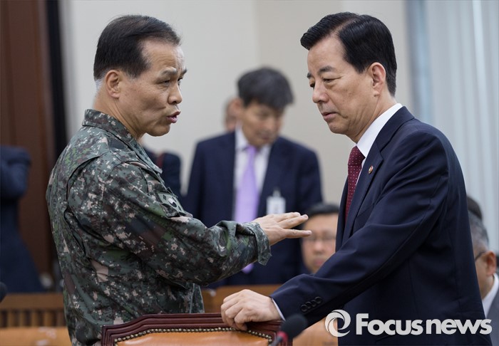 (서울=포커스뉴스) 한민구(오른쪽) 국방부 장관이 3일 오전 서울 여의도 국회에서 열린 국방위원회 전체회의에 참석해 정연봉 국방부 육군 참모차장과 대화하고 있다.