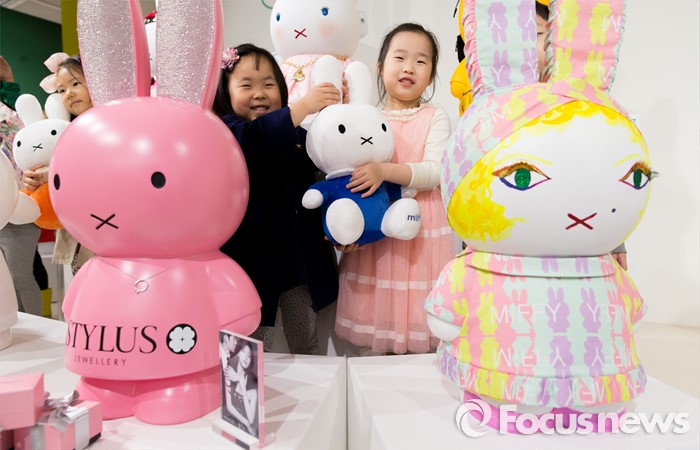 (서울=포커스뉴스) 3일 오전 서울 송파구 롯데백화점 잠실점 에비뉴엘 아트홀에서 '매니 미니 미피'아트 전시회를 찾은 어린이들이 콜라보레이션 미피와 기념촬영을 하고 있다. 미피 탄생 61주년 기념으로 열린 이번 전시는 오는 29일까지 열린다.