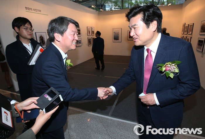 (서울=포커스뉴스) 3일 오전 서울 강남구 코엑스에서 열린 '52회 한국보도사진전 개막식'에 참석한 원유철(왼쪽) 새누리당 원내대표, 안철수 국민의당 상임공동대표가 악수하고 있다. '찰나의 기록, 시대의 진실'을 주제로 진행된 이번 전시는 시대의 진실을 기록한다는 사명감으로 역사의 현장을 묵묵히 지키며 취재한 수백만 컷 중 선정된 150여점과 '현장의 사진기자', '역대 대상 수상작' 등 250여점의 사진이 전시된다.