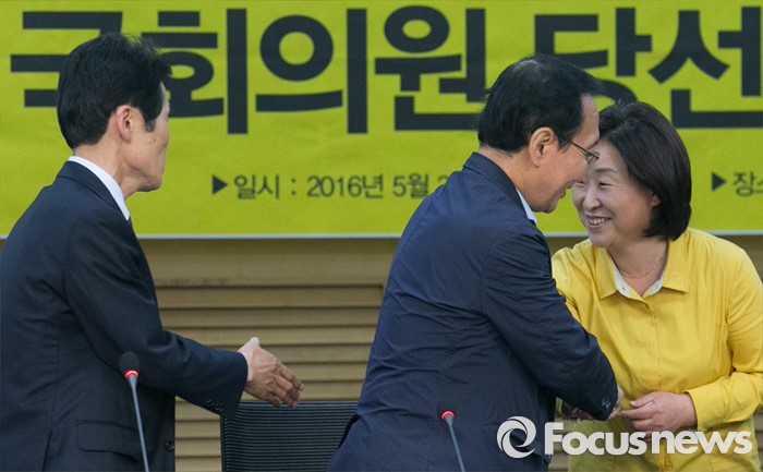 (서울=포커스뉴스) 심상정(오른쪽부터) 정의당 상임대표가 3일 오후 서울 여의도 국회 의원회관에서 열린 20대 총선 당선자 워크숍에 참석해 노회찬 당선인, 윤소하 비례대표 당선인과 인사하고 있다.
