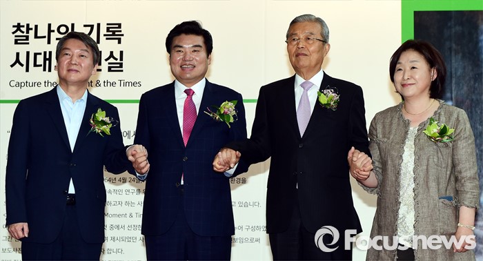 (서울=포커스뉴스) 3일 오전 서울 강남구 코엑스에서 열린 '52회 한국보도사진전 개막식'에 참석한 안철수(왼쪽부터) 국민의당 상임공동대표, 원유철 새누리당 대표최고위원 권한대행, 김종인 더불어민주당 비대위 대표, 심상정 정의당 상임대표가 손을 잡고 포즈를 취하고 있다. '찰나의 기록, 시대의 진실'을 주제로 진행된 이번 전시는 시대의 진실을 기록한다는 사명감으로 역사의 현장을 묵묵히 지키며 취재한 수백만 컷 중 선정된 150여점과 '현장의 사진기자', '역대 대상 수상작' 등 250여점의 사진이 전시된다.