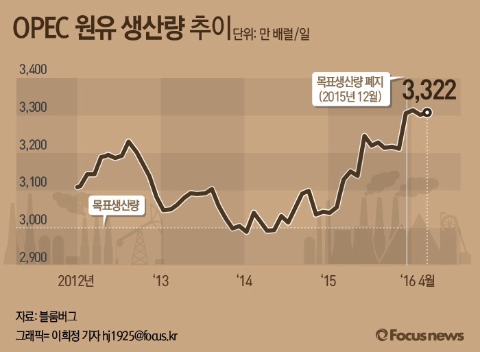 (서울=포커스뉴스) 4월 29일(현지시간) 불룸버그 자료에 따르면 OPEC 원유 생산량은 4월기준 하루 3,322만 배럴로늘어 20년 만의 최대치에 접근했다.