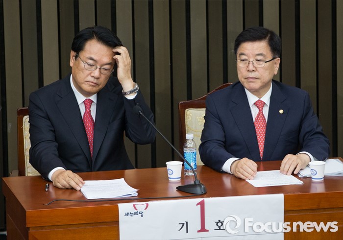 (서울=포커스뉴스) 정진석(왼쪽) 새누리당 원내대표 후보자와 김광림 정책위의장 후보자가 3일 오후 서울 여의도 국회에서 열린 새누리당 원내대표, 정책위의장 선출 및 당선자 총회에 참석하고 있다.